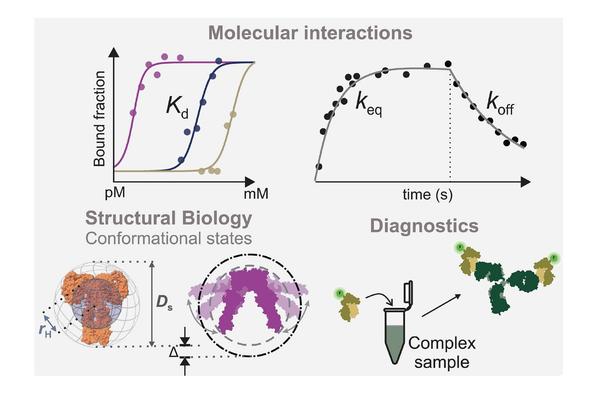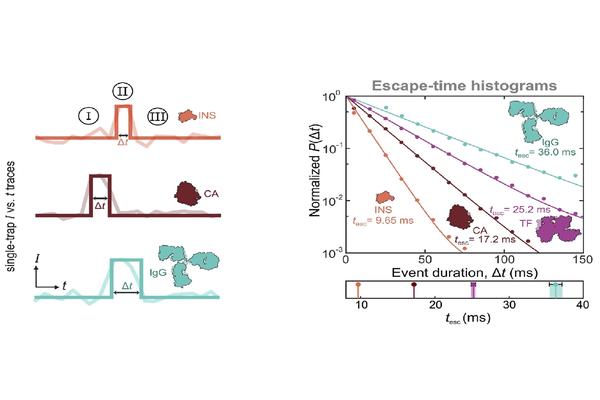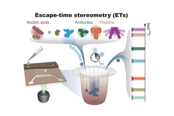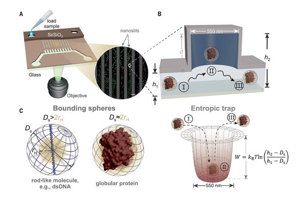 ETs is conducted in nanoslits containing small divots or pockets, that are considerably deeper than the slits themselves. The thin channels constrain the vertical movements of the molecules, while the pockets offer more vertical space and act as entropic 'traps'. Larger molecules remain in these regions for longer and the time taken for the molecules to escape these traps can inform us on the distribution of shapes and sizes present (stereometry). Using widefield fluorescent microscopy, molecules can be tracked in real time and structural changes can be observed live. Such conformational changes of biological molecules, e.g., those triggered in the insulin receptor upon ligand binding, could even provide valuable diagnostic approaches. ETs further permits probing of weak molecular interactions such as clustering of biomolecules which play crucial roles in biological function and are even implicated in neurological diseases . A deeper understanding of the underlying thermodynamics and kinetics of these interactions could lead to new insights into disease mechanisms and potential therapeutic strategies.
